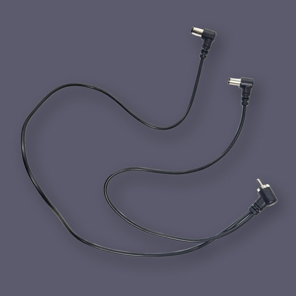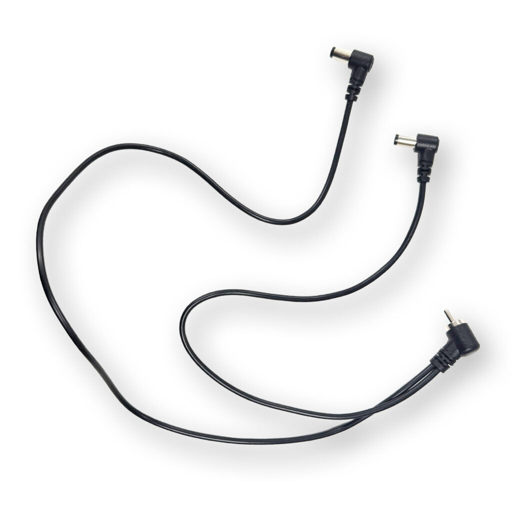 Split Flexを使用すると、1つのコンセントだけで2台のペダルを電源に接続することができます。長さ30cmと50cmの2本のケーブルが電源側のプラグに接続されています。もう一方の端は、最も一般的なタイプである5.5/2.1mmセンターマイナス・アングルDCプラグで終端されています。電源に接続された両方のペダルは同じ電圧で駆動され、互いに絶縁されることはありません。