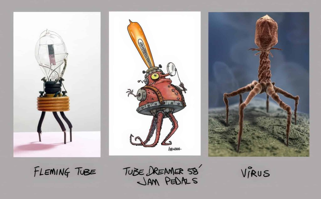 「自然に勝るものはないですね。インスピレーションを得るために、JAM PEDALSのキャラクターをデザインするために最初のアンプの真空管を調べていたら、1904年製のフレミング真空管を見つけました。それから最近、友人が電子顕微鏡で見たウイルスの実物写真を投稿してくれたんです。なんてこった…本当に不気味だ」