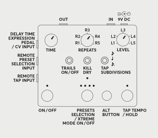 4つのプリセット、最大800msのディレイタイム、サブディビジョン付きのタップテンポ、ホールド機能、キルドライ、トレイル (バッファード)またはトゥルーバイパスモード、ディレイタイム用エクスプレッションペダル/CV入力、リモートタップテンポ入力、リモートプリセット選択入力を搭載。さらに、何時間でも夢中になれる4つのトレイルエフェクトも搭載しています。