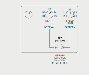 2.Tape-age:このモードは、ビンテージテープエコーマシンで物理的に「摩耗した」テープが生成するわずかでランダムなピッチ変動(震え)をエミュレートし、偏差の発生頻度を制御できます。