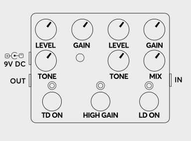 ・内部DIPスイッチでIN/OUTジャックを各オーバードライブ・サイドのセンド/リターンとして切り替えることで、スイッチャーで各サイドを個別にオンにしたり、シグナルチェーン内の異なるポイントに配置したりできます。ステレオ構成の場合は、TD側を1台のアンプ、LD側を別のアンプに接続することで、豊かなパラレル・オーバードライブ・サウンドが得られます。