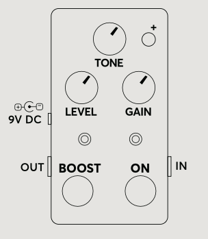 Boostフットスイッチは、回路の専用セクションを有効にします。このセクションは、Red Muckのフロントエンドにヒットしてさらに厚いファズディストーションの壁を生成するように個別に調整されています。また、ゲインを低く設定すると、ハイゲイン ステージフットスイッチとして機能します。